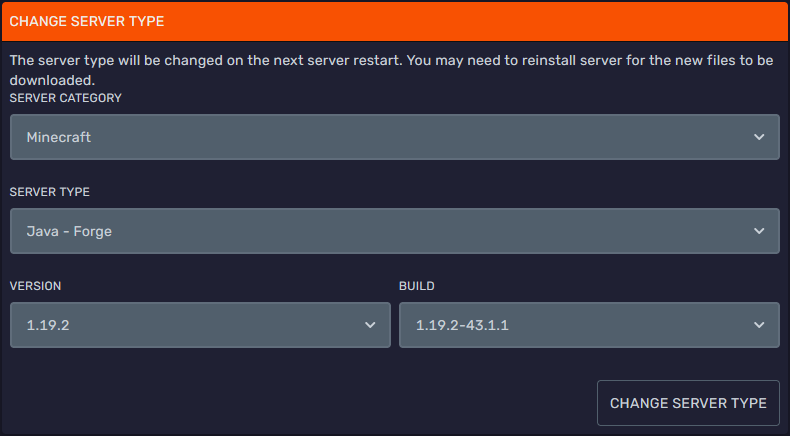 First, navigate to the Settings tab and find Change Server Type. Once there set up the change server type menu for installing forge.